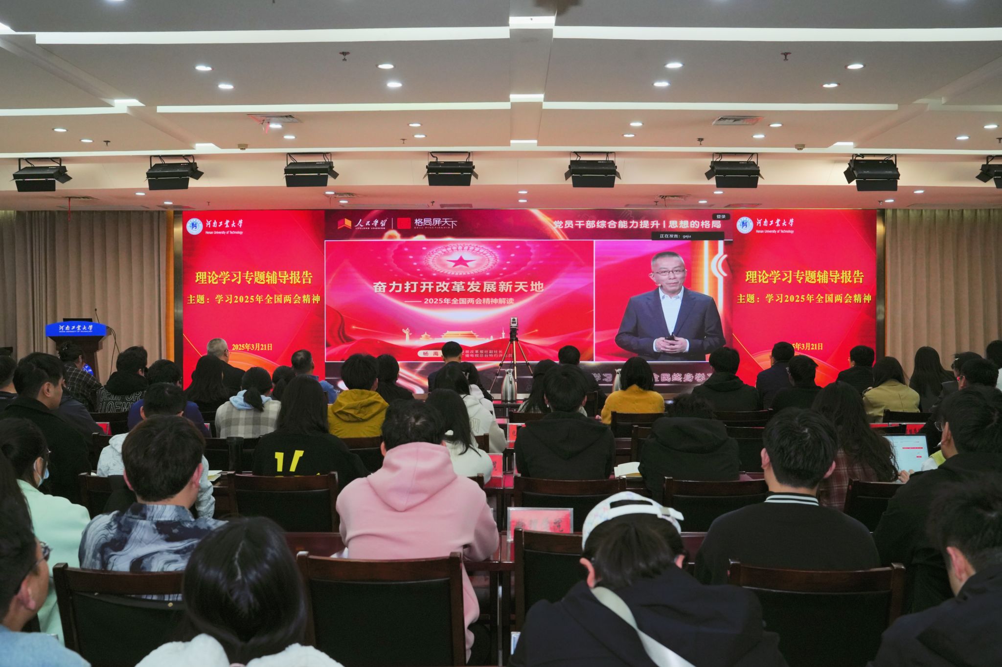 春潮涌動啟新程。2025年全國兩會于3月11日在北京勝利閉幕。3月21日下午,學校在學術(shù)報告中心D205舉行全國兩會精神專題輔導報告會,學習習近平總書記在全國兩會期間重要講話精神和全國兩會精神。本次學習通過人民學習平臺在線收聽收看中國發(fā)展改革報社副社長、中央廣播電視總臺特約評論員楊禹主講的“2025年全國兩會精神解讀”專題報告。校黨委副書記、工會主席周相寅,校黨委副書記黃澤峰及各職能部門、教學單位師生代表參加集中學習。
