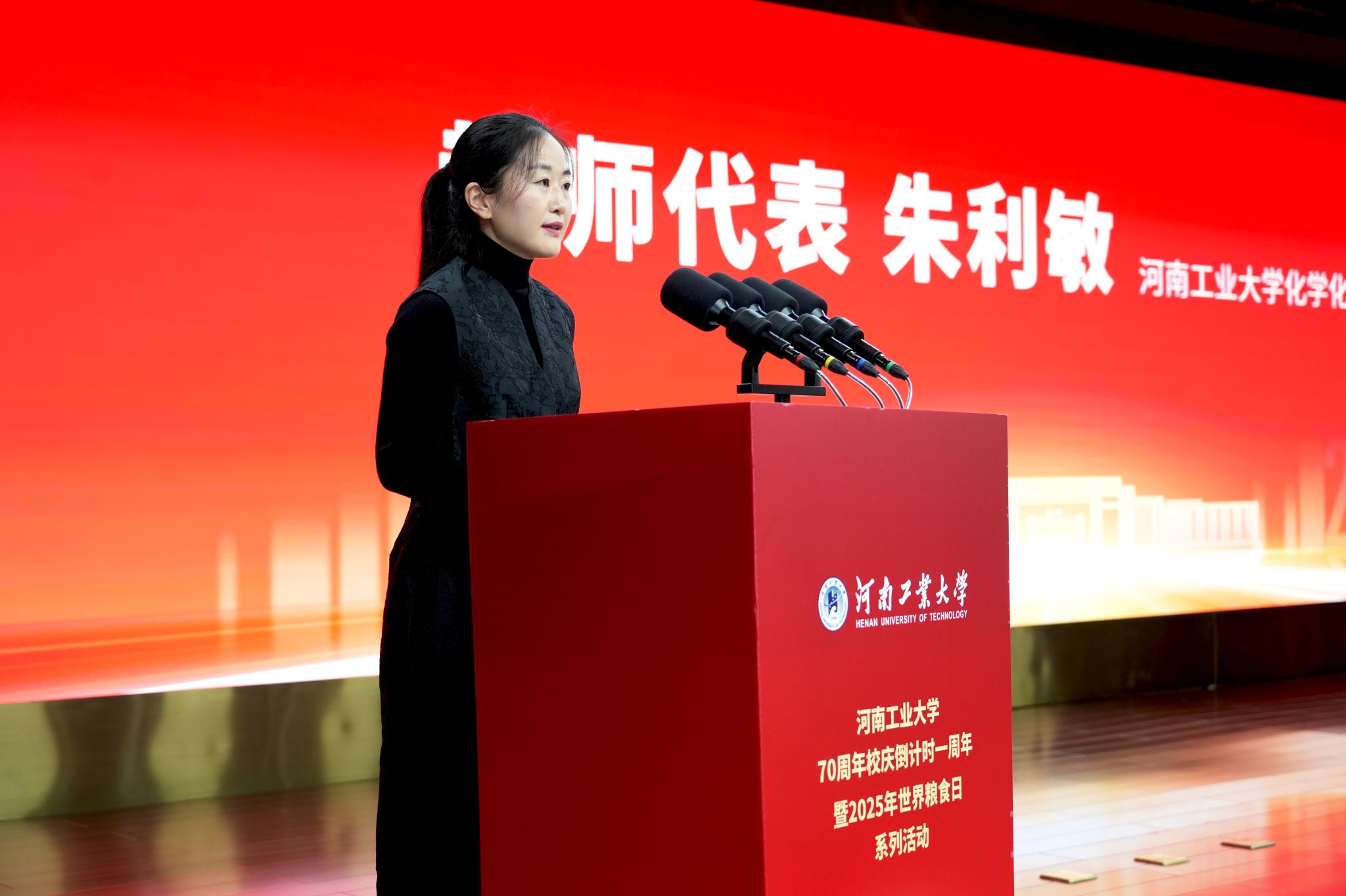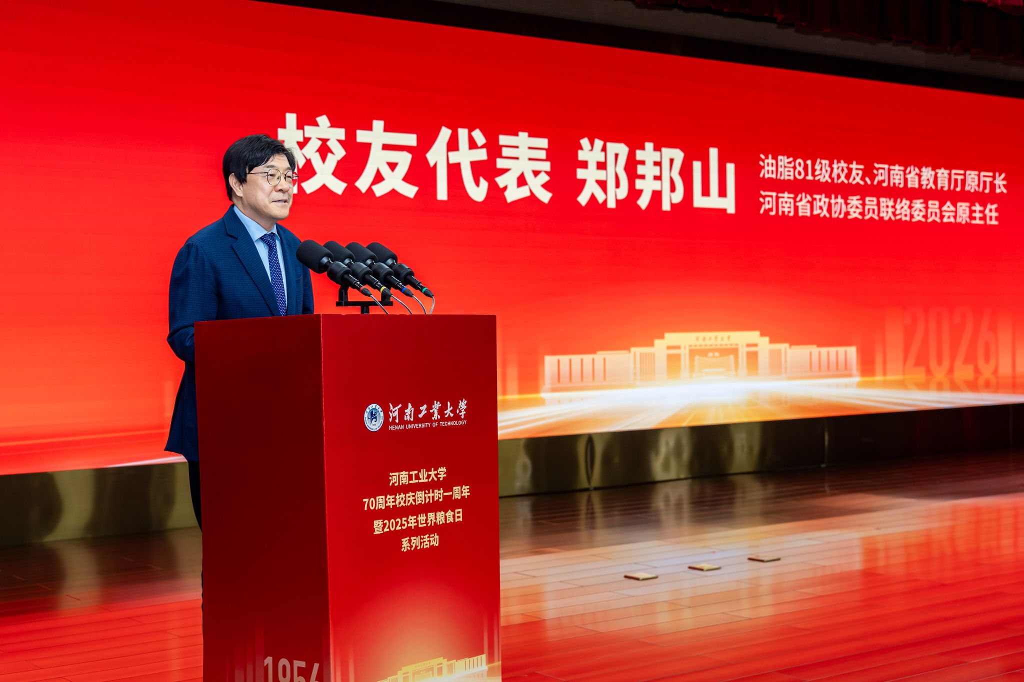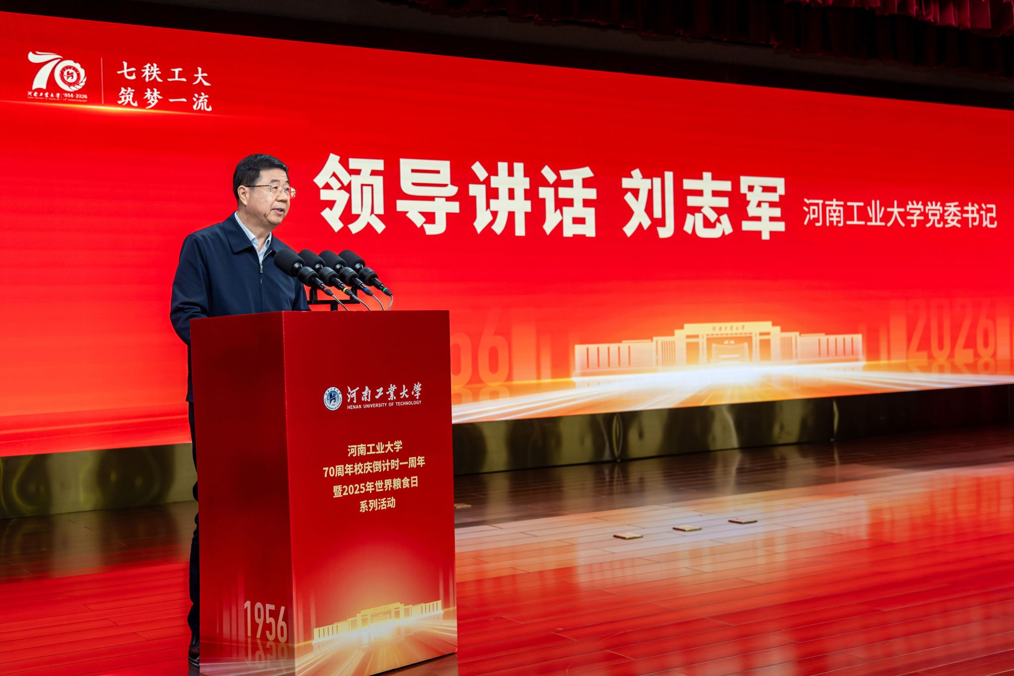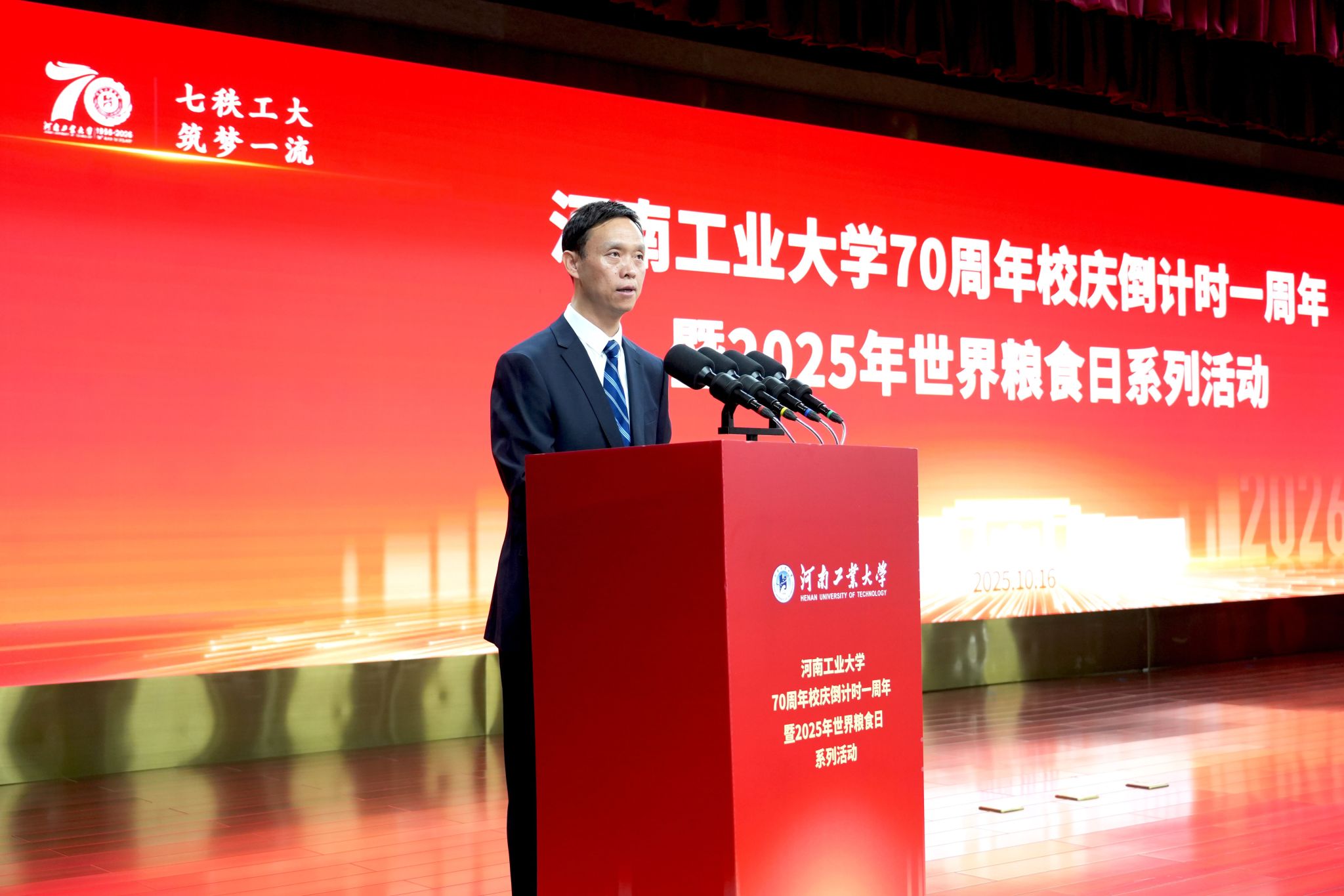 七秩風華,薪火相承。10月16日,“河南工業大學70周年校慶倒計時一周年暨2025年世界糧食日系列活動”在蓮花街校區學術報告中心D303報告廳舉行。全體在校校領導、特邀嘉賓、中層干部、離退休老同志、校友代表、師生代表齊聚一堂,共同見證這一重要時刻。活動共分四個階段,第一階段為“70周年校慶倒計時一周年活動”,由校黨委副書記黃澤峰主持。