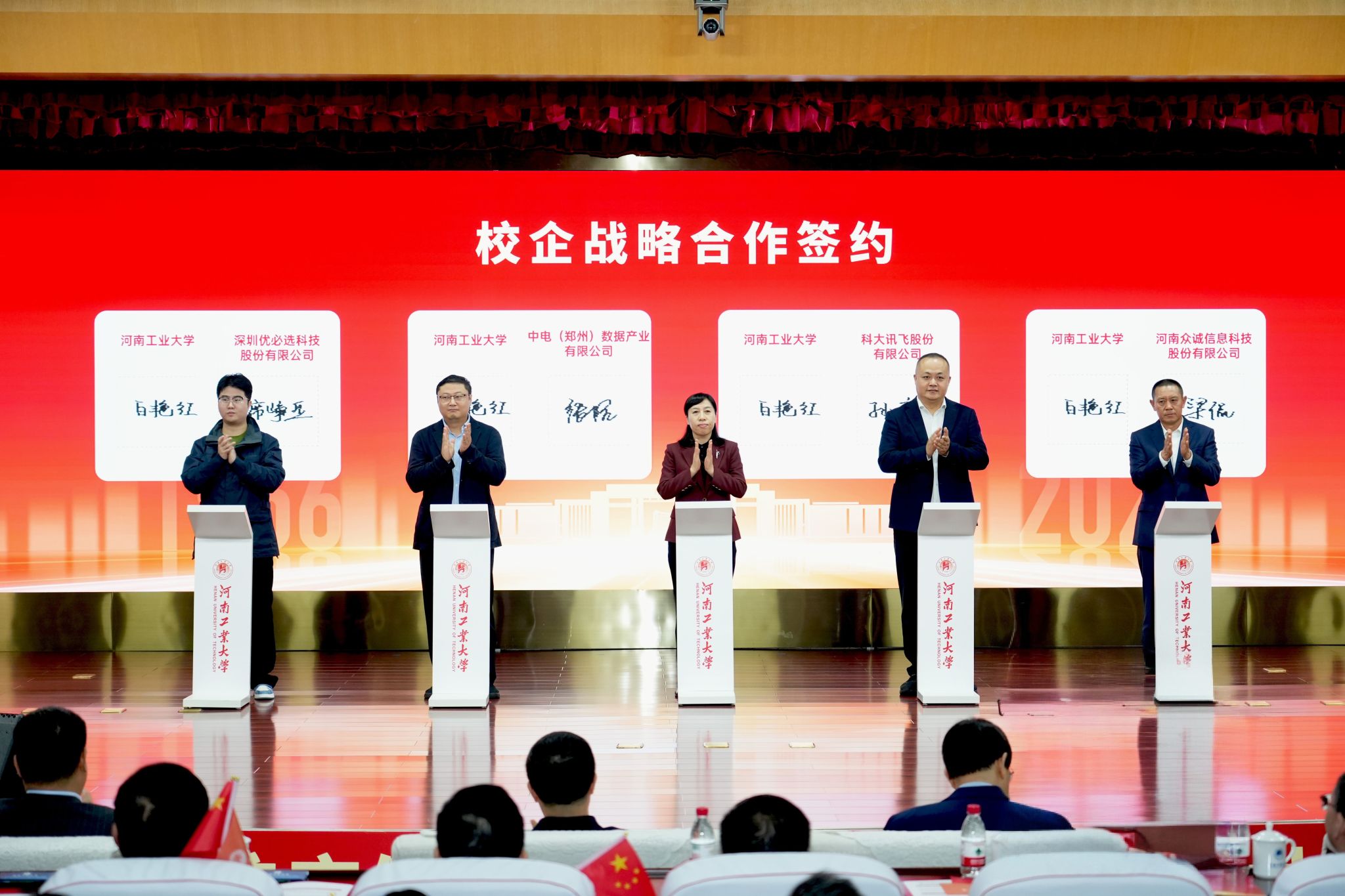 隨后,學校與科大訊飛股份有限公司等多家企業進行校企戰略合作簽約和校企橫向科研項目合作簽約。簽約儀式后,河南省優青、化學化工學院朱利敏教授作為教師代表發言,她表示將立足本職崗位,傳承和弘揚“工大精神”,為建設特色鮮明的一流工業大學貢獻自己的全部智慧和力量。