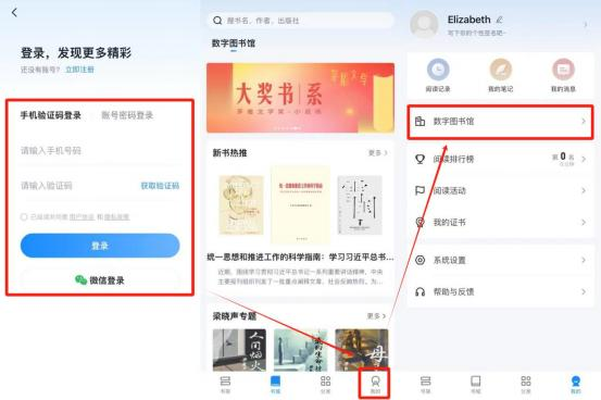 3. APP 登錄閱讀步驟:如下圖,下載元閱讀 APP 后,用手機(jī)號(hào)或微信進(jìn)行注冊(cè)登錄,然后點(diǎn)擊“我的 ”—“數(shù)字圖書(shū)館”,在內(nèi)容框中輸入所在學(xué)校名稱,即可綁定機(jī)構(gòu),綁定機(jī)構(gòu)后可隨時(shí)登錄APP進(jìn)行閱讀。