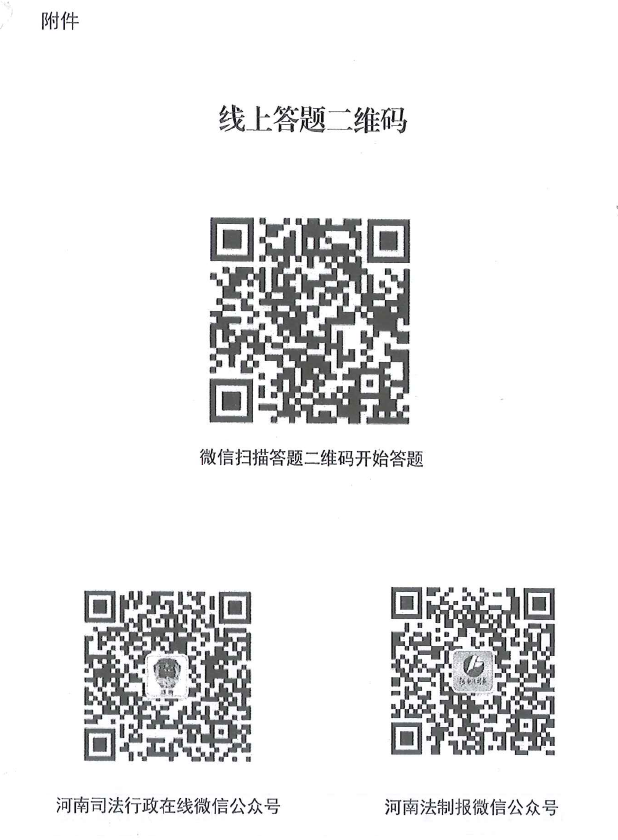 登錄“河南司法行政在線”“河南法制報社”微信公眾號二維碼(見附件),點擊下方“知識競賽”即可進入答題頁面,競答者需要填寫姓名、單位、地區(qū)、手機號等信息后開始答題。