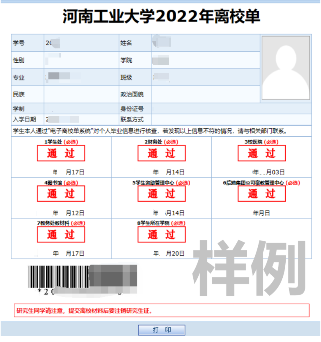 3.畢業生個人登錄系統(用戶名、密碼默認均為學號),查看各單位審核情況。全部項目審核通過的,即可在系統內打印離校單(見附圖離校單樣例)交至學院,完成離校手續。如有“未審核”“未通過”的項目,或對審核信息有異議的,請及時聯系相應部門或到現場處理。