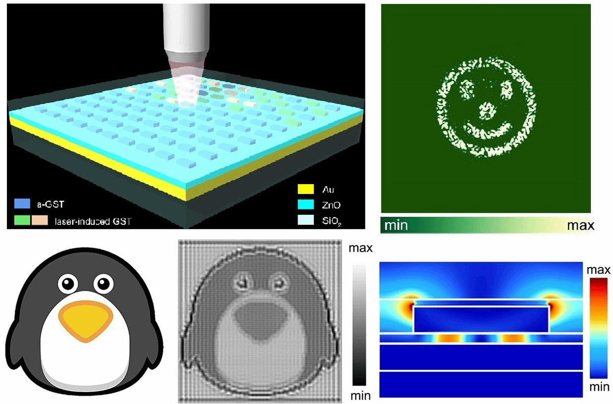 相變材料在相變前后具有明顯的光學性質(zhì)差異,是實現(xiàn)主動調(diào)控超表面的一種理想的功能材料。盡管相變材料超表面在光場的主動調(diào)控方面取得一定的進展,但是如何將多種可重構(gòu)的光學功能集成到單個超表面中仍有待解決。基于此,作者通過將結(jié)構(gòu)化的相變材料(Ge2Sb2Te5,GST)納米棒陣列與激光直寫技術相結(jié)合,實現(xiàn)了可重構(gòu)的光場波前控制。通過精確控制激光的位置和功率,激光直寫技術有助于實現(xiàn)GST納米棒的定點、多級相變。由于GST材料的多級相變可提供多級光學性質(zhì)的調(diào)控,GST棒陣列可實現(xiàn)有效的振幅和相位調(diào)控。在此基礎上,我們基于單一超表面設計了各種光學器件,如相位全息成像、光束偏折器、灰度成像、完美吸收器等。結(jié)合激光直寫技術的GST超表面為可重構(gòu)光場調(diào)控的實現(xiàn)提供了一種有效的方法。