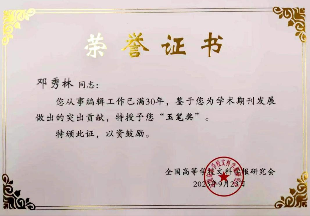 《河南工業(yè)大學(xué)學(xué)報(社會科學(xué)版)》社會科學(xué)編輯室副編審鄧秀林榮獲“玉筆獎”