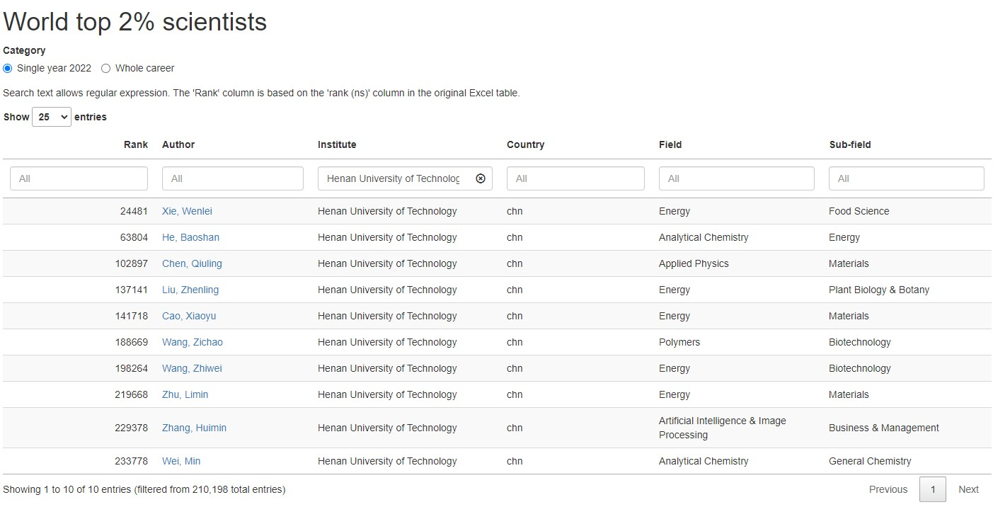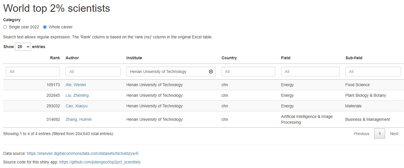 河南工業大學教師入選全球前2%科學家“終身科學影響力排行榜”情況(2023版)