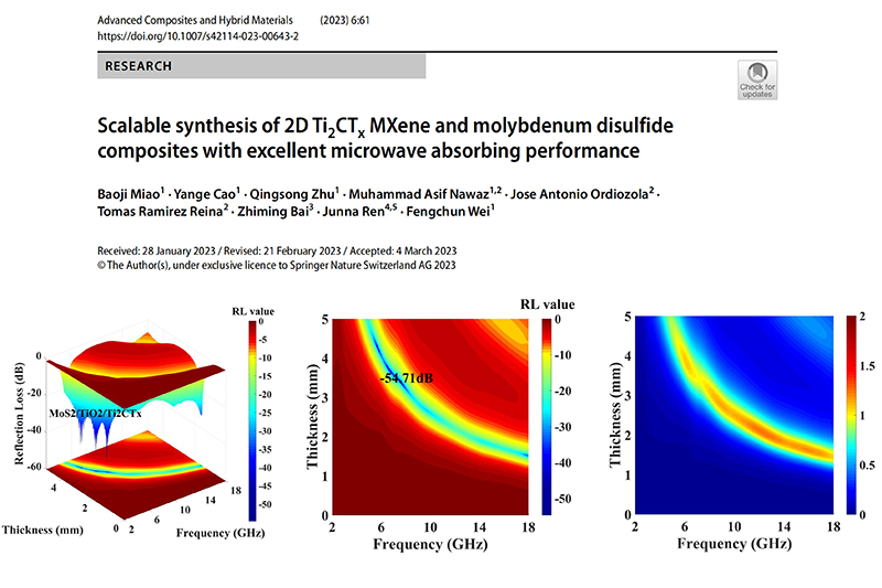 近日,我校材料科學與工程學院河南省納米光電磁國際聯合實驗室與西班牙“塞維利亞無機化學與材料科學研究所”和北京航空航天大學合作在國際知名學術期刊Advanced Composites and Hybrid Materials(即時 IF=19.155)上發表了題為“Scalable synthesis of 2D Ti2CTxMXene and molybdenum disulfide composites with excellent microwave absorbing performance”(DOI: 10.1007/s42114-023-00643-2)的研究論文。苗保記博士及其所指導研究生曹燕格為共同第一作者,朱青松博士和Muhammad Asif博士后為共同通訊作者,河南工業大學為論文第一署名和通訊作者單位。