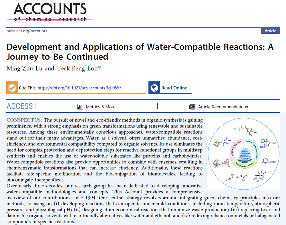 近日,我校前沿交叉科學與技術學院(CAIST)羅德平院士團隊應邀在國際頂級學術期刊《Accounts of Chemical Research》(影響因子IF = 18.3)發表題為“Development and Applications of Water-Compatible Reactions: AJourney to Be Continued”(DOI: 10.1021/acs.accounts.3c00555)的綜述性論文。前沿交叉科學與技術學院羅德平院士為通訊作者,河南工業大學為該論文的第一署名單位。