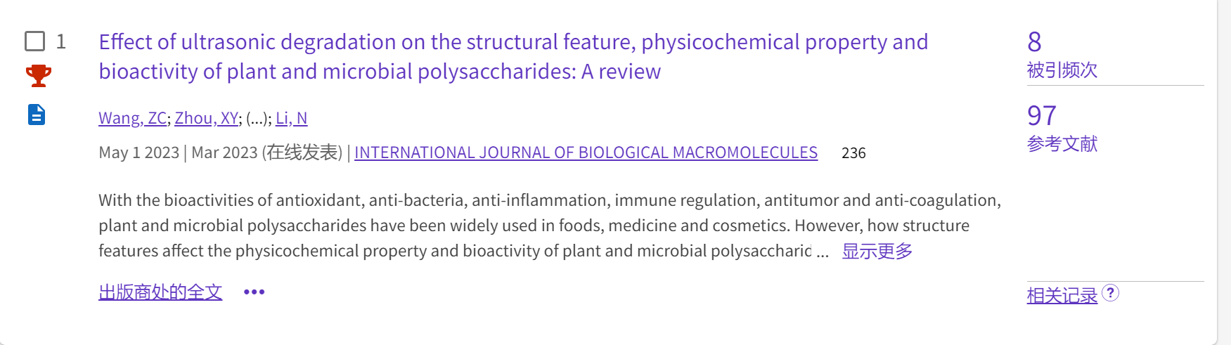 據2023年11月基本科學指標數據庫(Essential Science Indicators,簡稱ESI)統計數據顯示,河南工業大學生物工程學院王子朝副教授等于2023年03月發表于功能多糖領域《International Journal of Biological Macromolecules》(中科院一區,TOP期刊,IF=8.2)上的綜述論文“Effect of ultrasonic degradation on the structural feature, physicochemical property and bioactivity of plant and microbial polysaccharides: A review”,被ESI數據庫遴選為高被引論文。